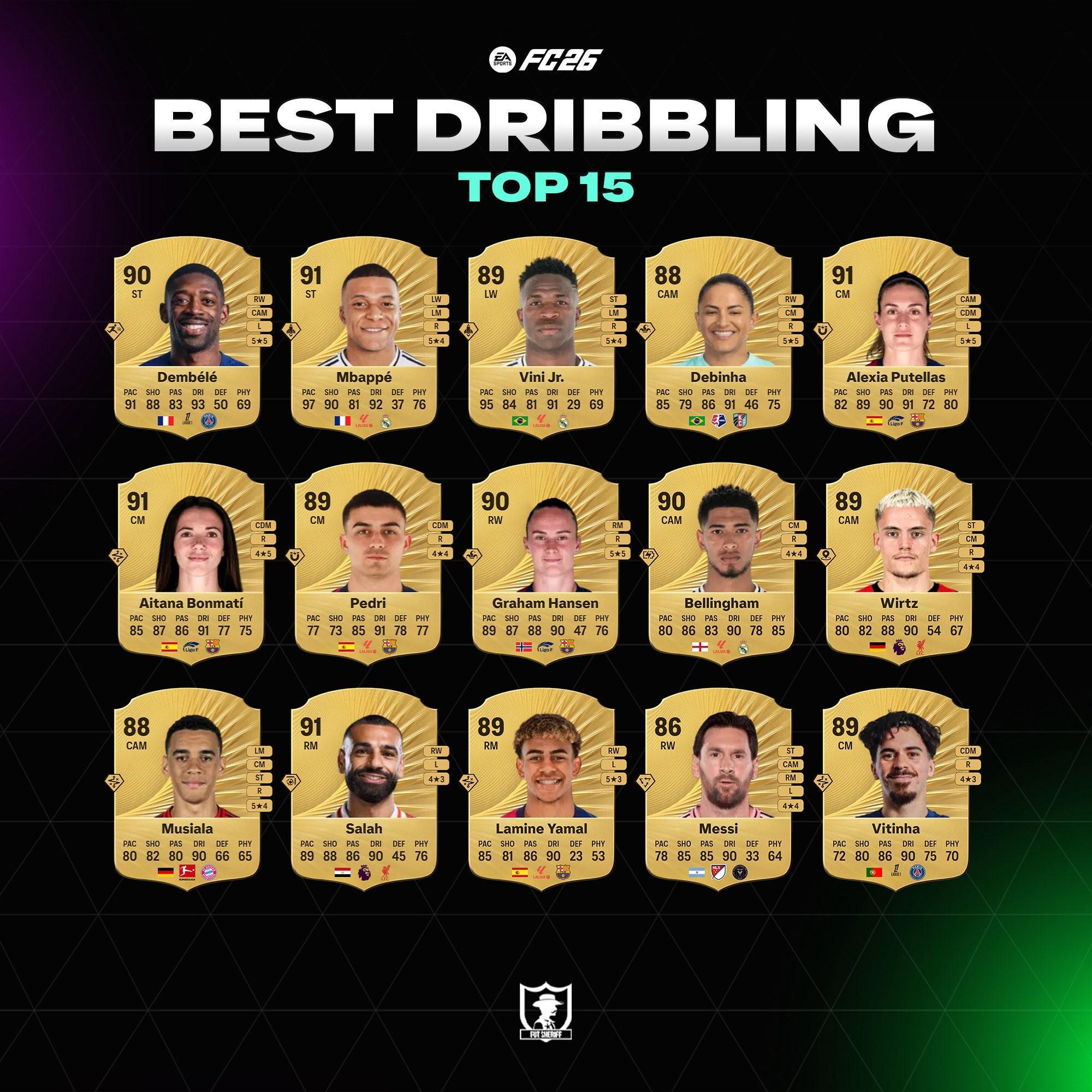 《FC26》中盘带前15的球员已经遭到曝光,其中,登贝莱第一,姆巴佩第二,贝林厄姆、亚马尔在列。